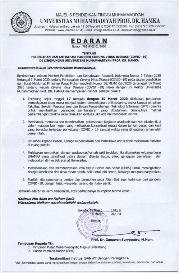 Edaran Rektor UHAMKA Tentang Pencegahan dan Antisipasi Pandemi Corono Virus Disease (Covid-19)