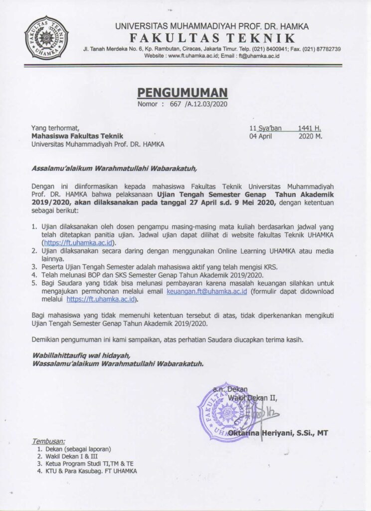 Pengumuman UTS Genap Fakultas Teknik TA. 2019-2020 (27 April – 09 Mei 2020)