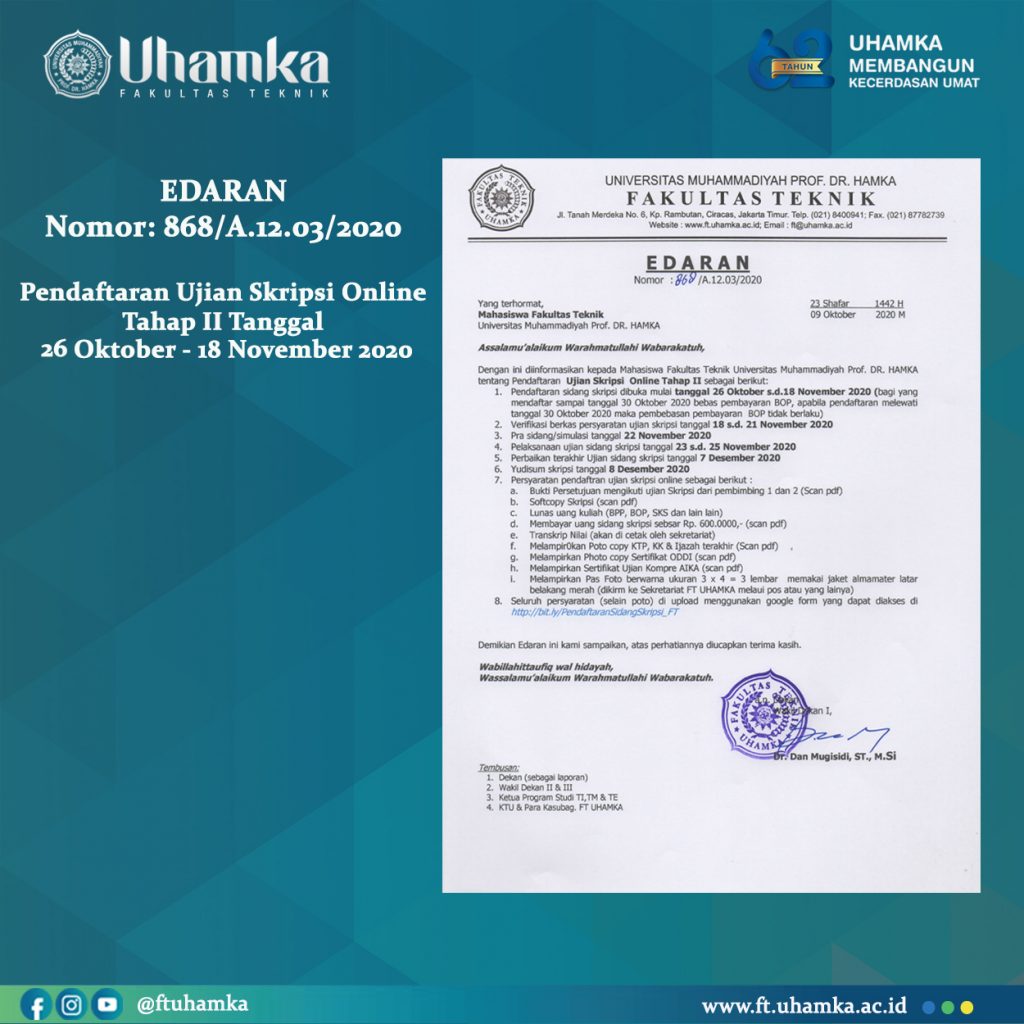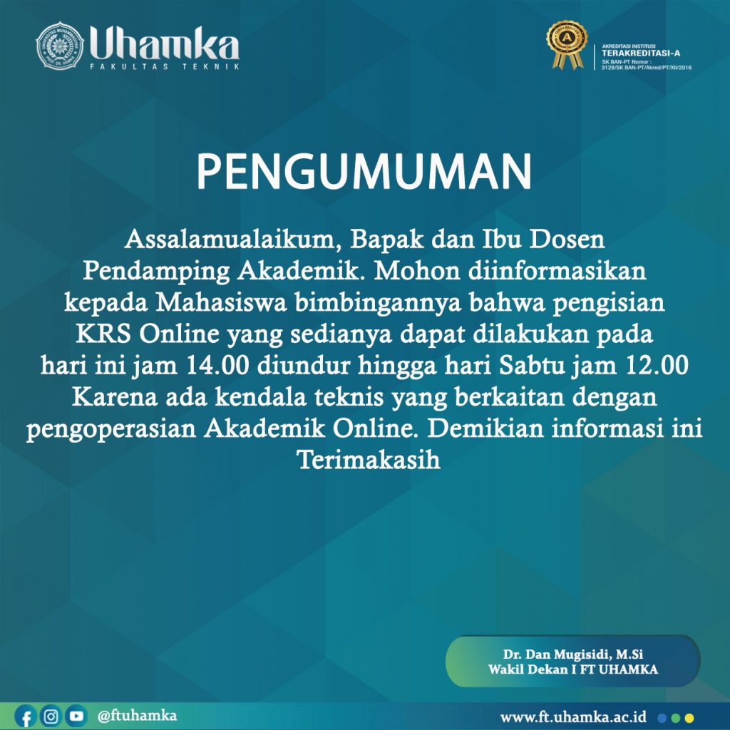Situasi Pandemi Covid-19 memaksa orang untuk berubah, hampir di semua sendi kehidupan, baik masalah Kesehatan, ekonomi, sosial, dan budaya. Semua dituntut untuk beradaptasi. Sehingga pengembangan teknologipun juga semakin cepat, karena dipaksa oleh keadaan. Dekan Fakultas Teknik UHAMKA, Sugema dalam sambutannya mengatakan bahwa “Fakultas Teknik merupakan institusi pendidikan yang memiliki tanggung jawab moral dalam membantu masyarakat […]