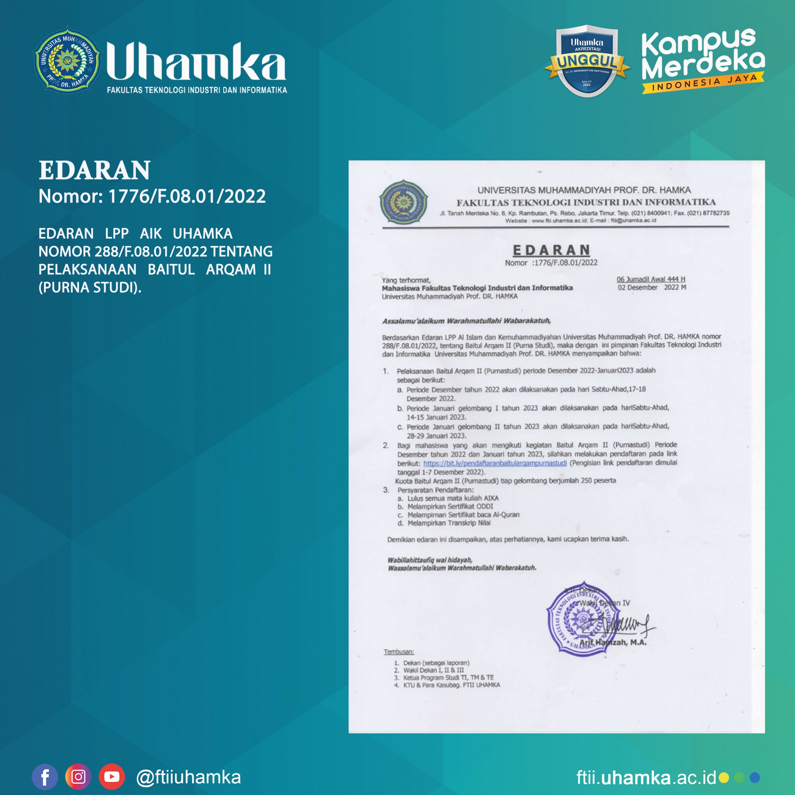 PEMBERITAHUAN: Berdasarkan Edaran LPP Al Islam dan Kemuhammadiyahan Universitas Muhammadiyah Prof. DR. HAMKA nomor 243/F.08.01/2022, tentang Baitul Arqam Mahasiswa Purna Studi, maka dengan ini pimpinan Fakultas Teknik Universitas Muhammadiyah Prof. DR. HAMKA menyampaikan bahwa: 1.Pendaftaran Baitul Arqam Mahasiswa Purna studi Bulan Oktober a.Pendaftaran dimulai pada tanggal 15 – 30 September 2022 b.Mahasiswa melakukan pendaftaran ke […]